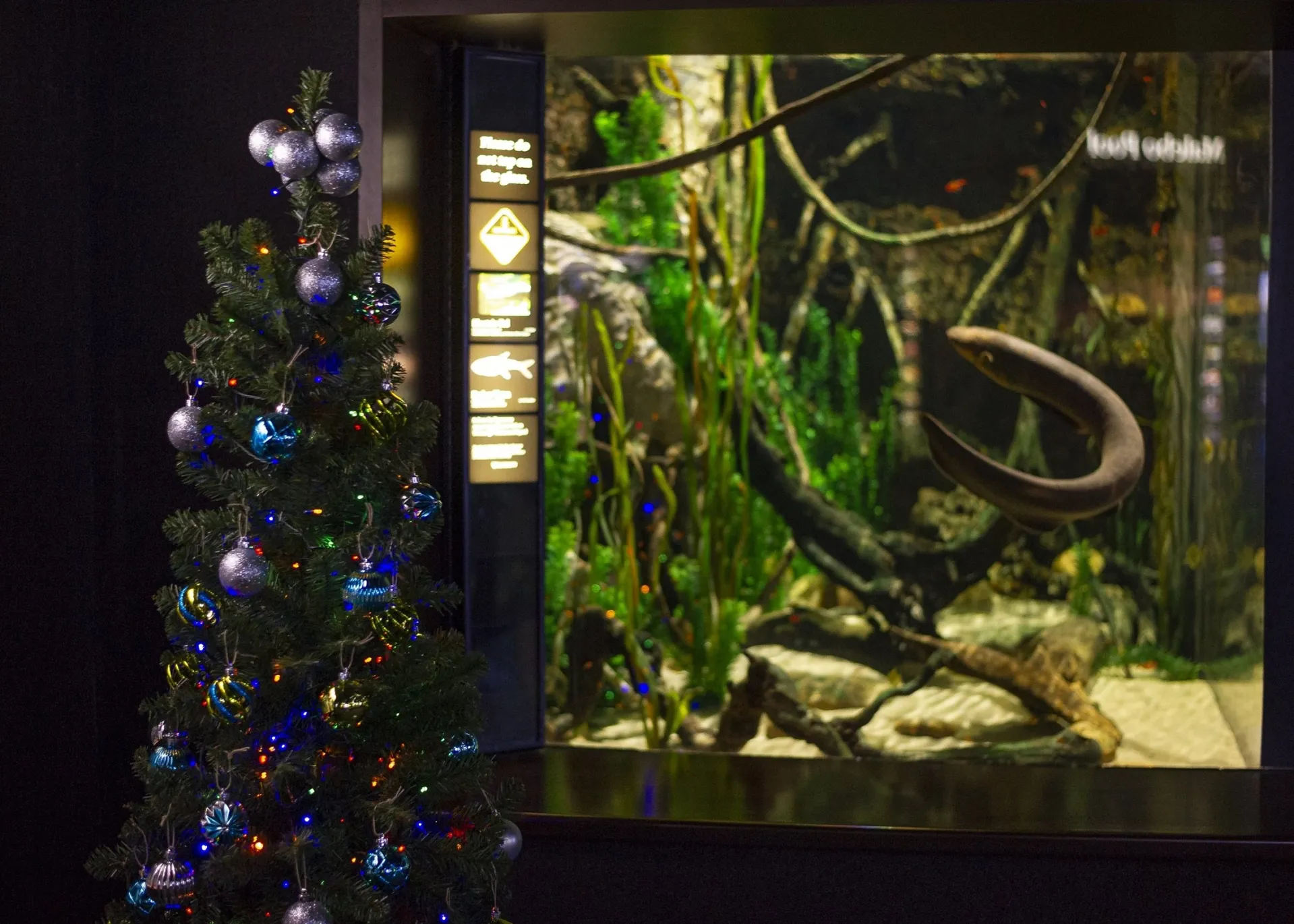 The Aquarium’s Electric Eel, Miguel Wattson, serves as unofficial tree-lighter in the Rivers of the World gallery.
