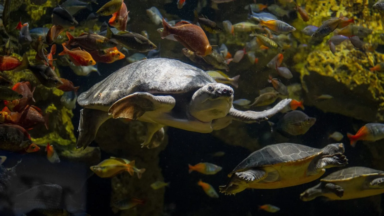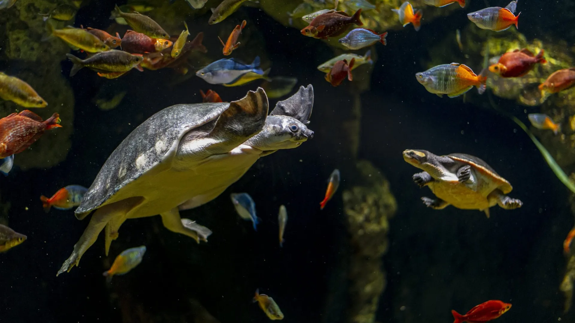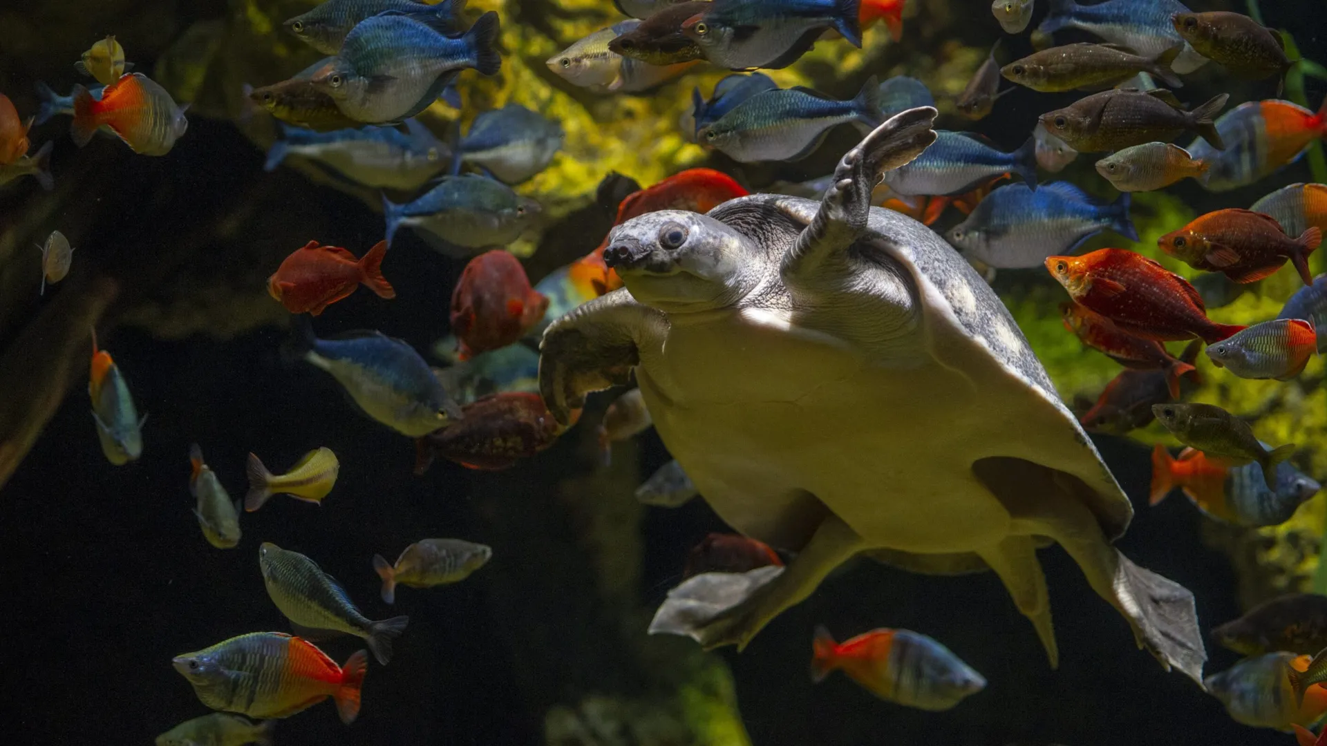 The pig-nosed turtle (also known as the Fly River turtle) is a living fossil as it is the sole living member of a family of turtles that was once more widespread. Found only in Australia and New Guinea, the pig-nosed turtle has paddles instead of feet on its front legs (like a sea turtle) and a snorkel-shaped snout that gives rise to its common name.