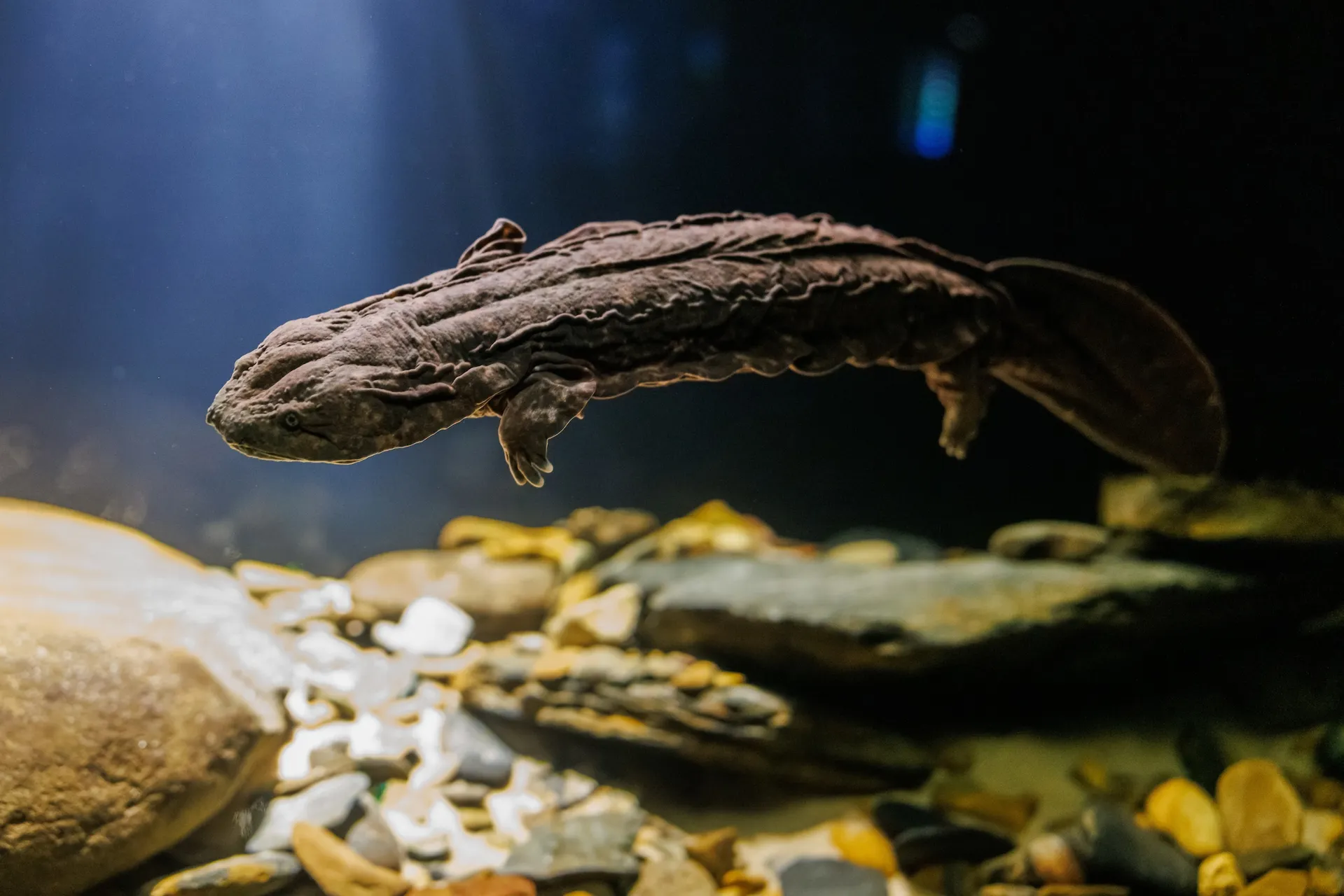 The hellbender is the largest species of salamander in the eastern United States. It spends most of its time under rocks and stream debris where its flattened body and dull colors make it nearly impossible to see. Here it waits patiently for its next meal to pass by. It breathes by absorbing oxygen directly from the water through its wrinkled skin. The wrinkles give the hellbender more surface area to absorb greater amounts of oxygen.