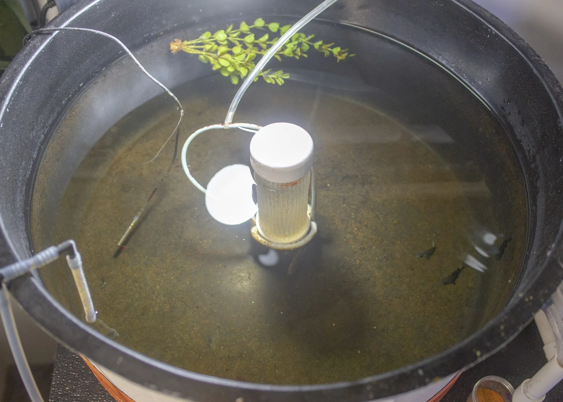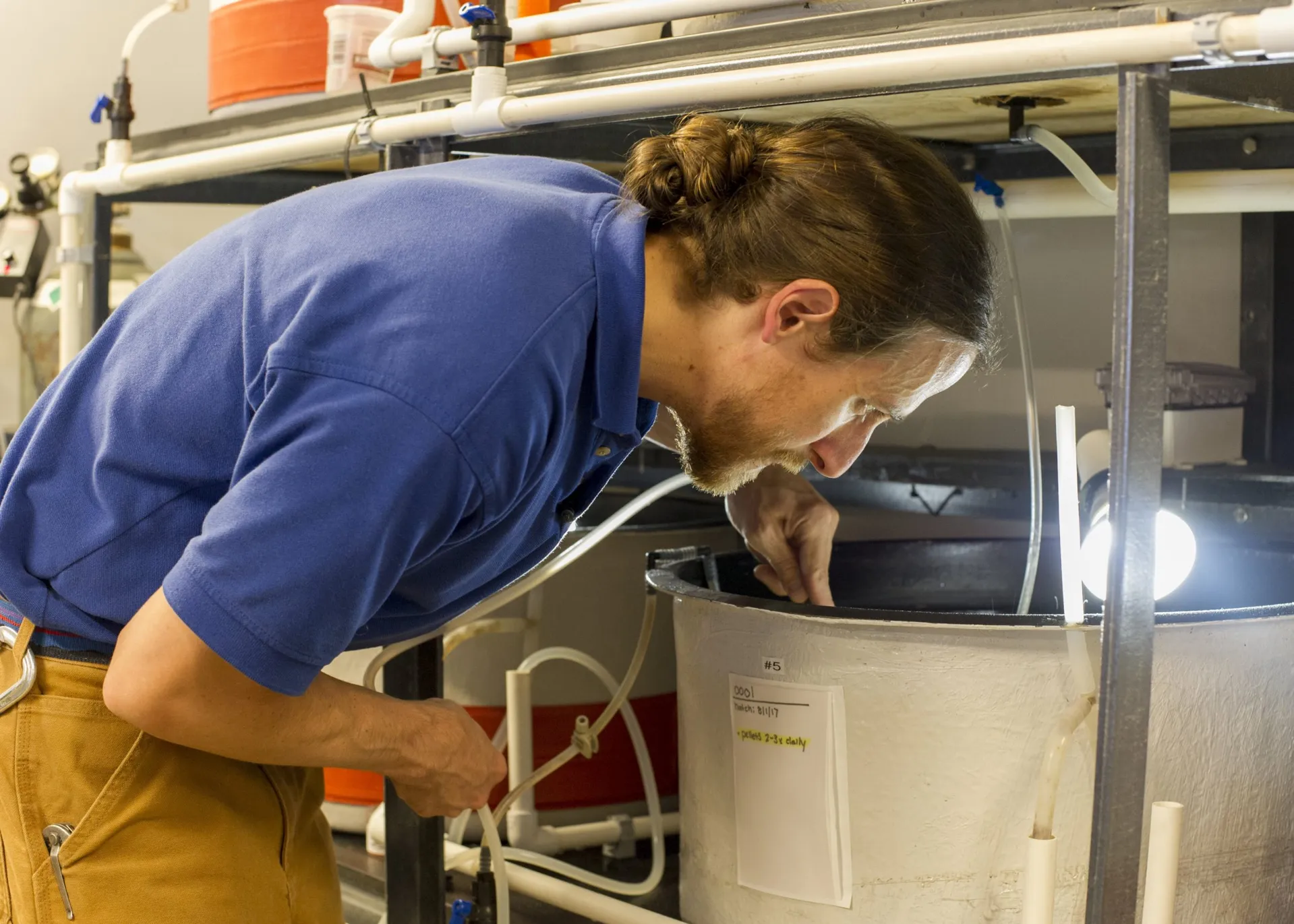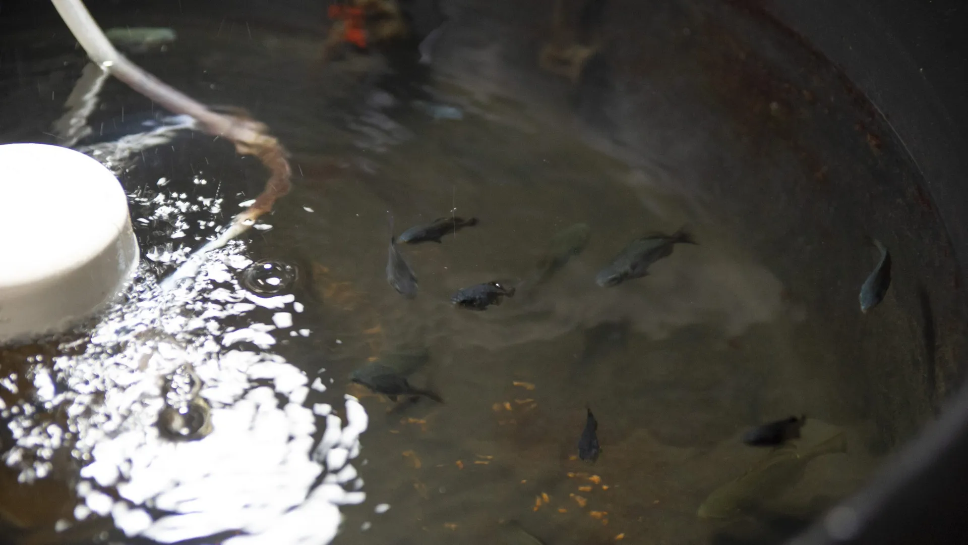 As the Isochrysis reproduce, the burbling water in the vessels darkens in color, shifting at first from a golden amber to the deep brown of over-steeped tea. Once it becomes sufficiently algae-rich, the vessels are poured into nearby tubs filled with copepods, which can, in turn, be fed to the larval fish.