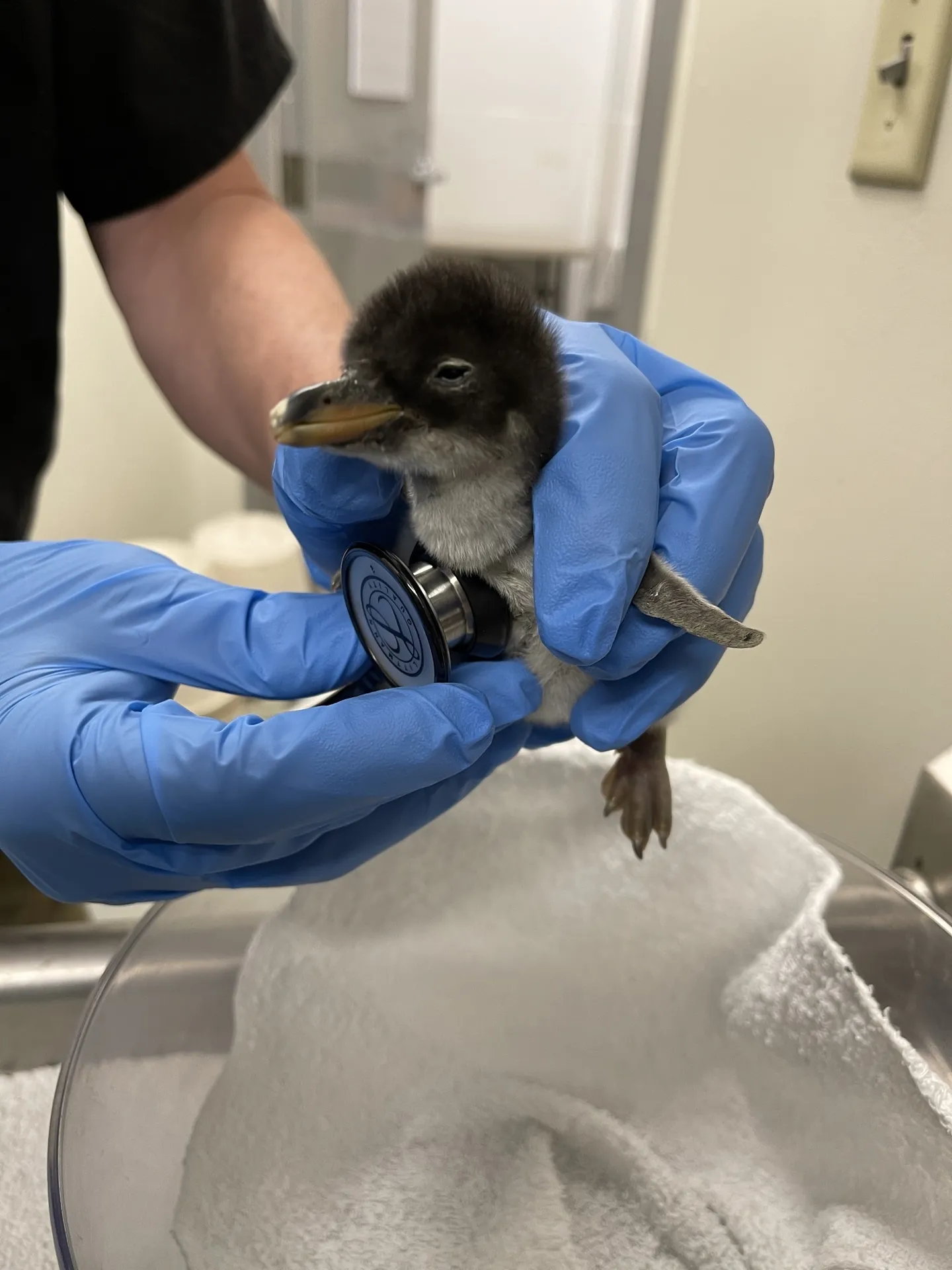 During a routine veterinary checkup the day after it hatched, the chick weighed 132 grams — about 4.5 ounces. After a month of attentive care by its parents and close observation by Aquarium staff, the formerly tiny, peeping ball of fluff now weighs 2.4 kilograms (5.3 pounds), an increase of more than 1,800 percent. If a human child were to grow at the same rate, a newborn weighing seven pounds at birth would tip the scales at 127 pounds four weeks later.