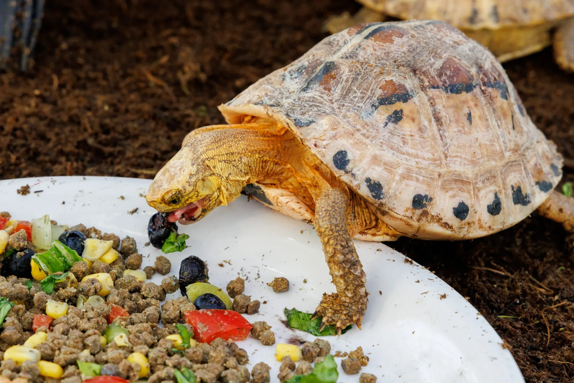 This combination of dry food, fruit and roughage helps ensure the turtles receive a nutritionally complete meal twice a week. As temperatures fall and their metabolisms slow down, though, they may not clean their plates again until spring arrives.