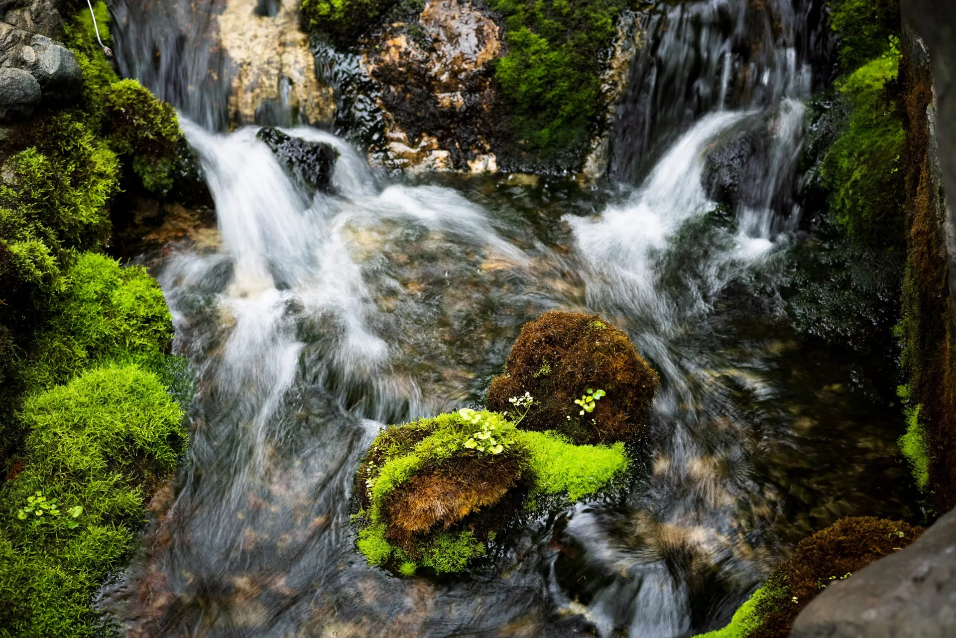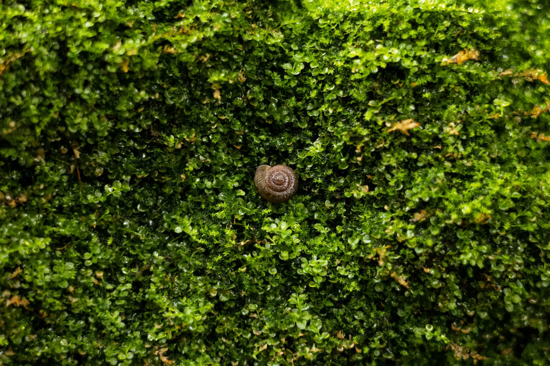 A loamy carpet of moss coats a boulder in the Appalachian Cove Forest. Grey stone peeks from beneath, where a thin trickle of water seeps past a lazily grazing snail to form a spout running down wet rock to the forest floor.