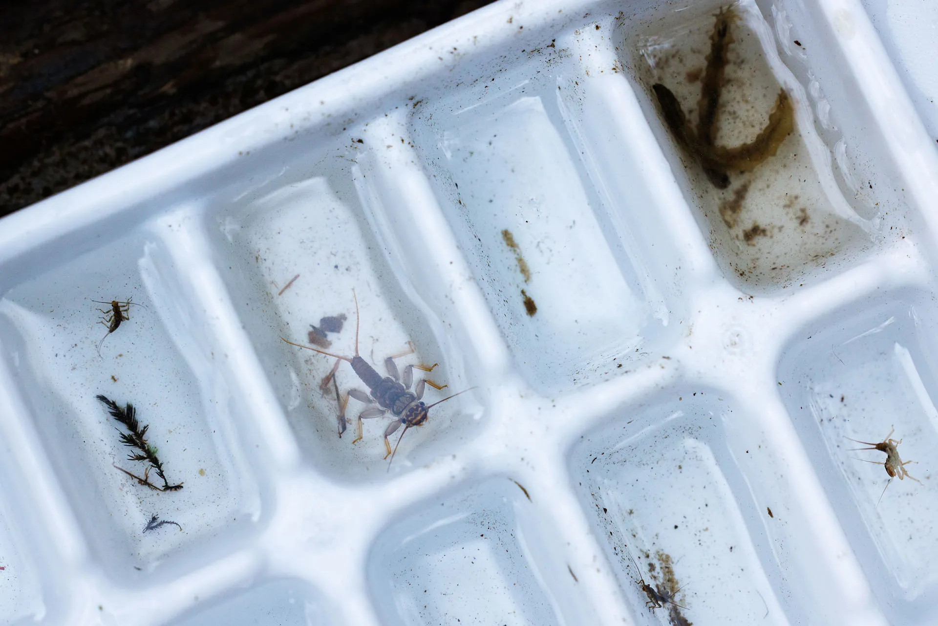 As they sift through trays material collected from the water, the students excitedly pluck each new find from the containers – with tweezers or bare hands – and set them aside for closer viewing. Damselfly nymphs, aquatic worms and even a juvenile Spring Salamander are among the group’s finds in this pristine aquatic environment.