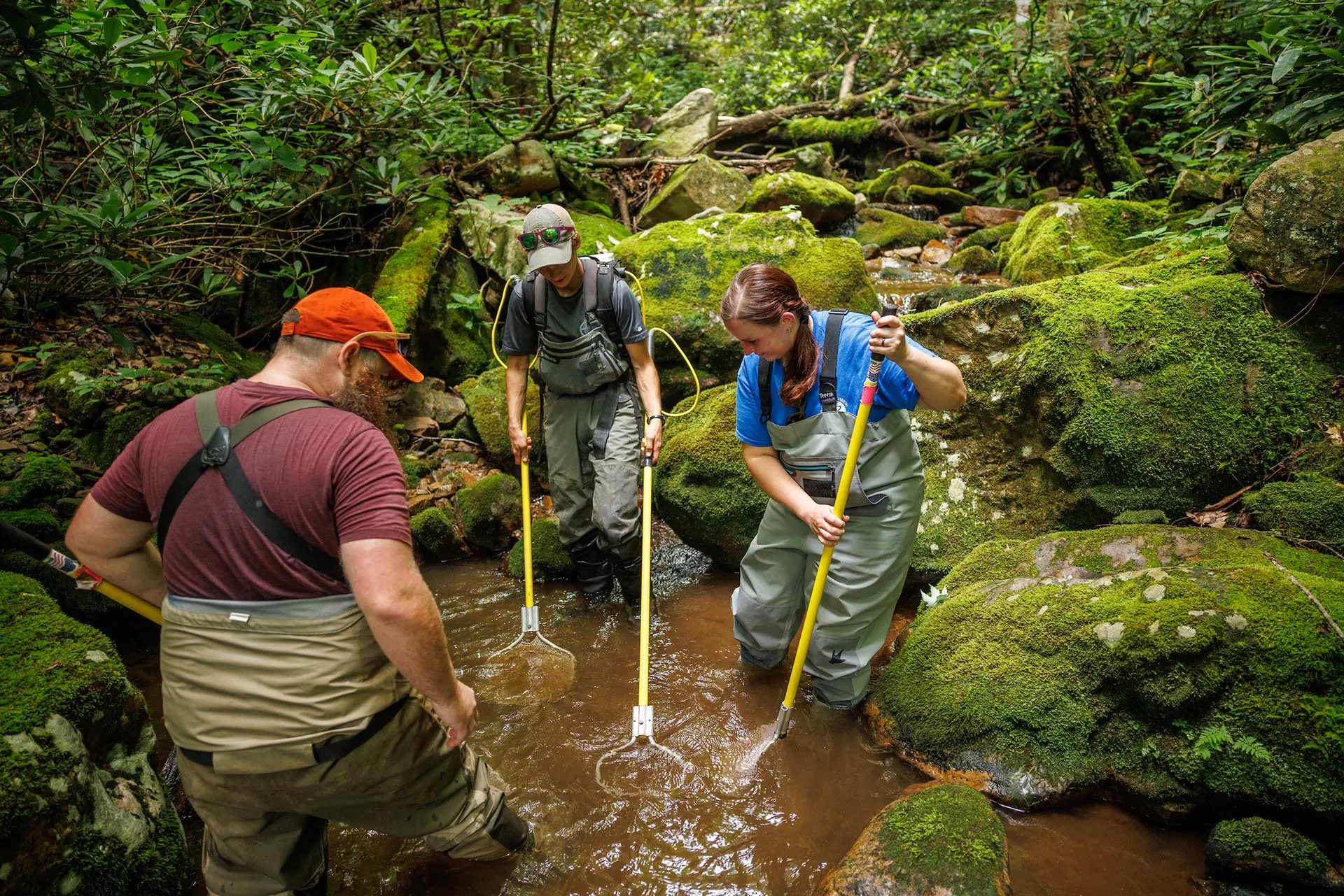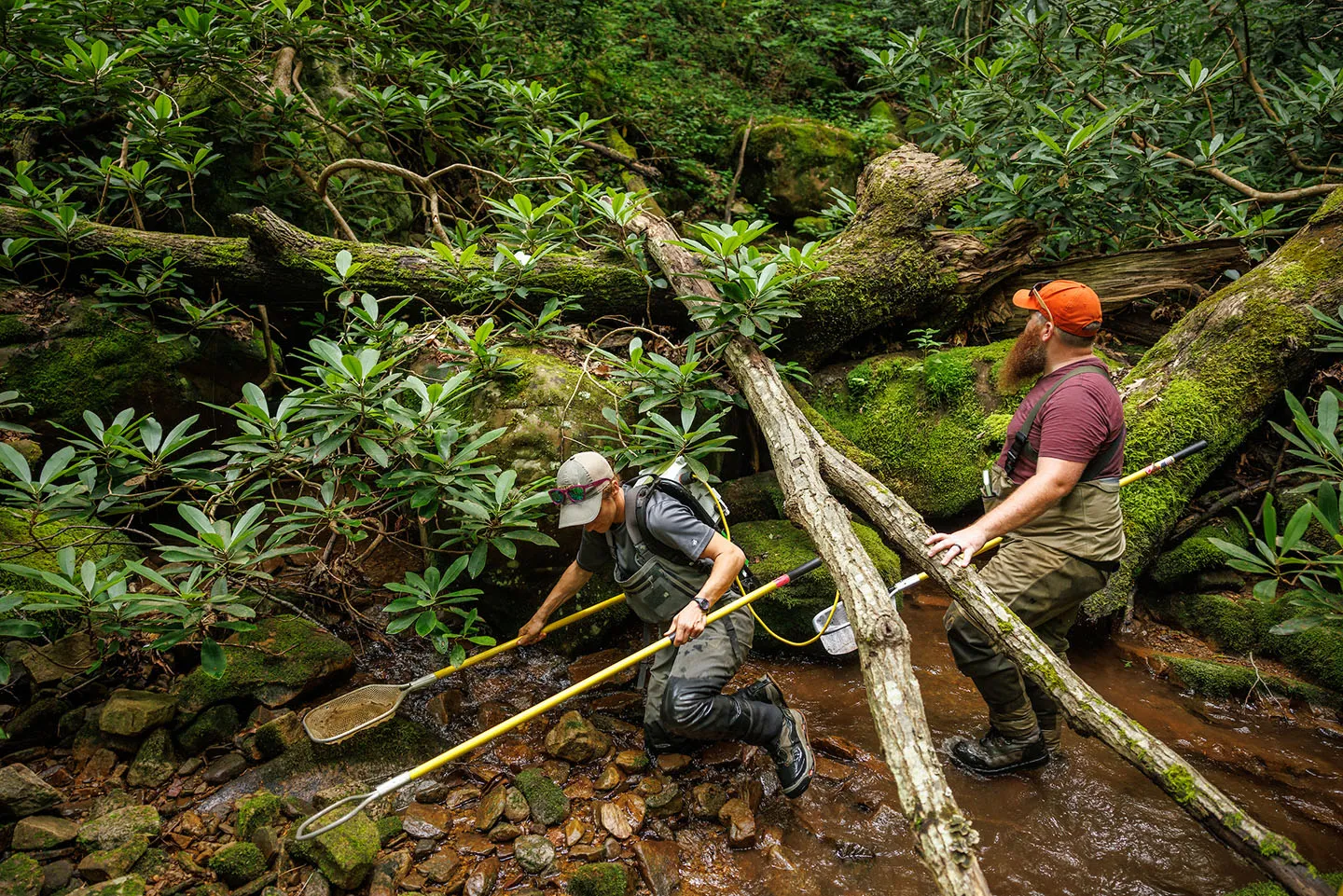 Walking through waters that vary from ankle to waist deep and climbing over mossy boulders and beneath hanging mountain laurels, the team waves a metal wand through the fast-flowing water and watches for activity.