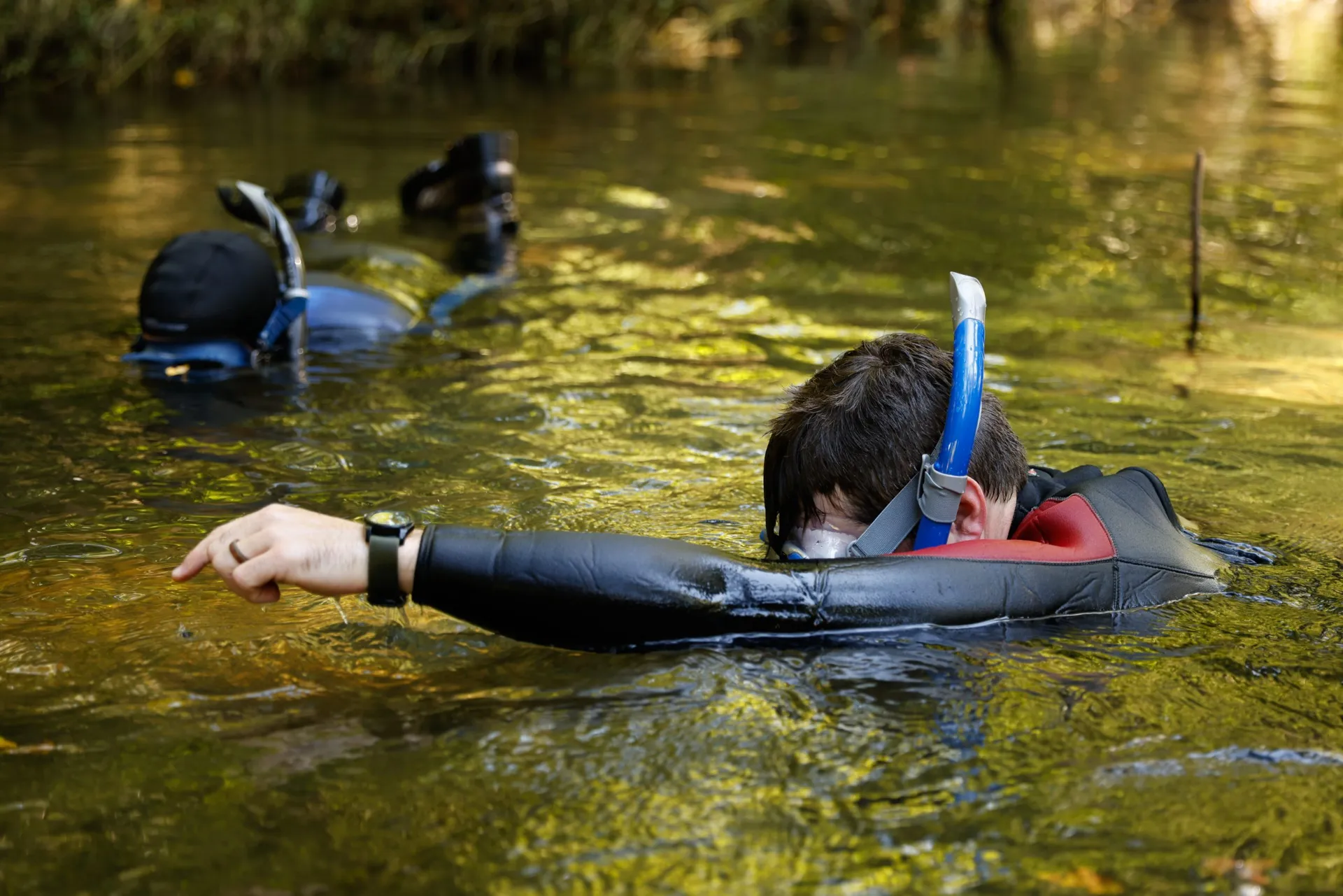 Floating, mask down, in the water, a team of three to four snorkelers methodically work their way upstream through the clear water, eyes peeled for Bridled Darter sightings. When one is found, a spotter indicates its location, and Kuhajda and an assistant deploy a seine net nearby. Carefully, snorkelers then work in tandem to herd the fish into the net, where it can be isolated and lifted out.