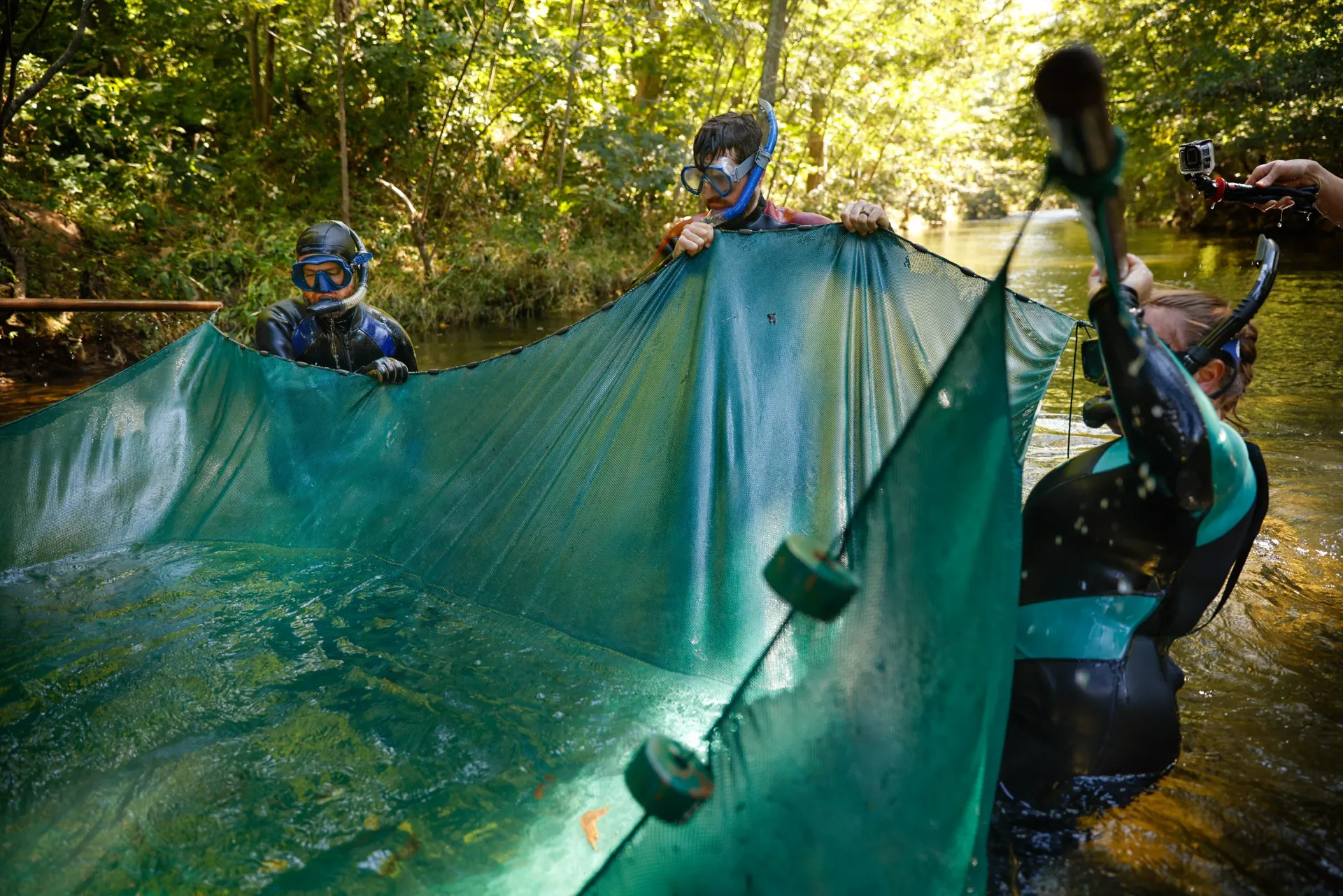In many cases, field work to assess the biological richness of a waterway is done with backpack electro-shockers that apply current into the water to temporarily stun fish, making them easy to count. For work with imperiled (or potentially imperiled) species, however, Aquarium scientists often opt for the use of seine nets that can passively collect species carried into them by the current or startled into it by conservationists before being lifted out of the water.