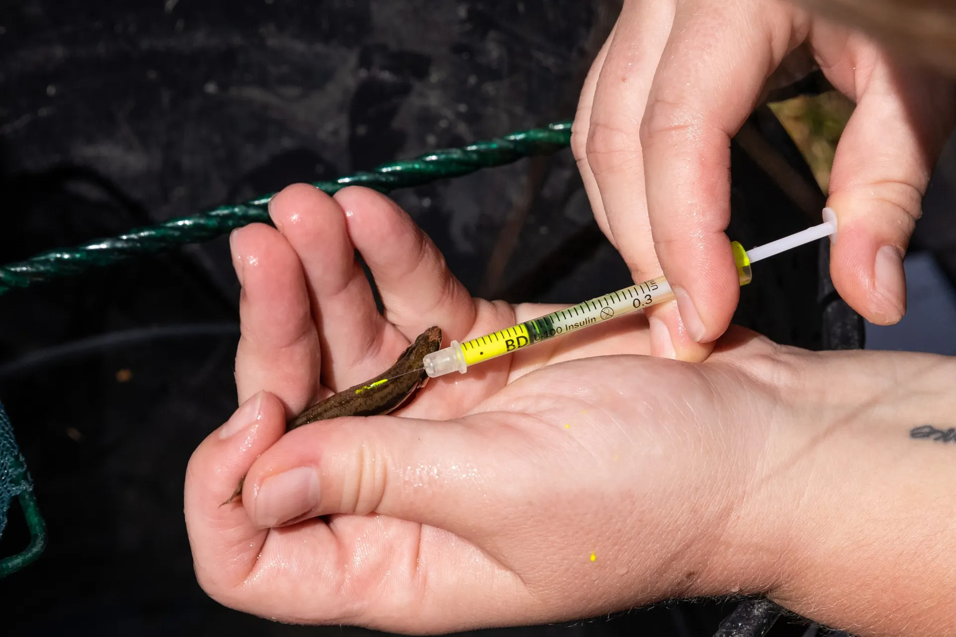 The team marks each fish with a brightly colored, safe dye to prevent repeat collection. Additionally, a tiny piece is cut from its tail fin.