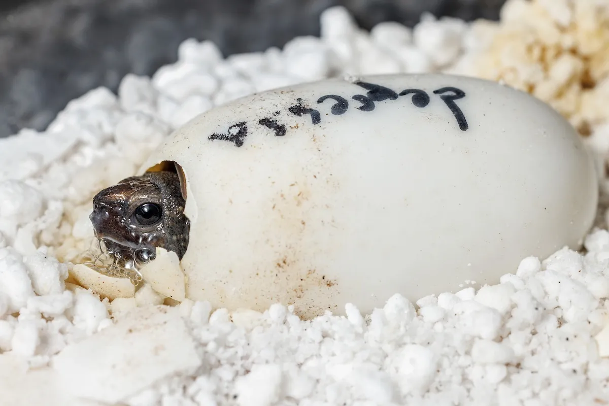 The parents of these adorably teeny turtles are a pair of adults hatched at Zoo Atlanta and sent to the Aquarium as juveniles. The female laid a clutch of five eggs in late November of 2022. The first hatchling, measuring less than three inches long, emerged overnight from its oblong egg in an off-exhibit incubator on Thursday, March 23. The second followed four days later.