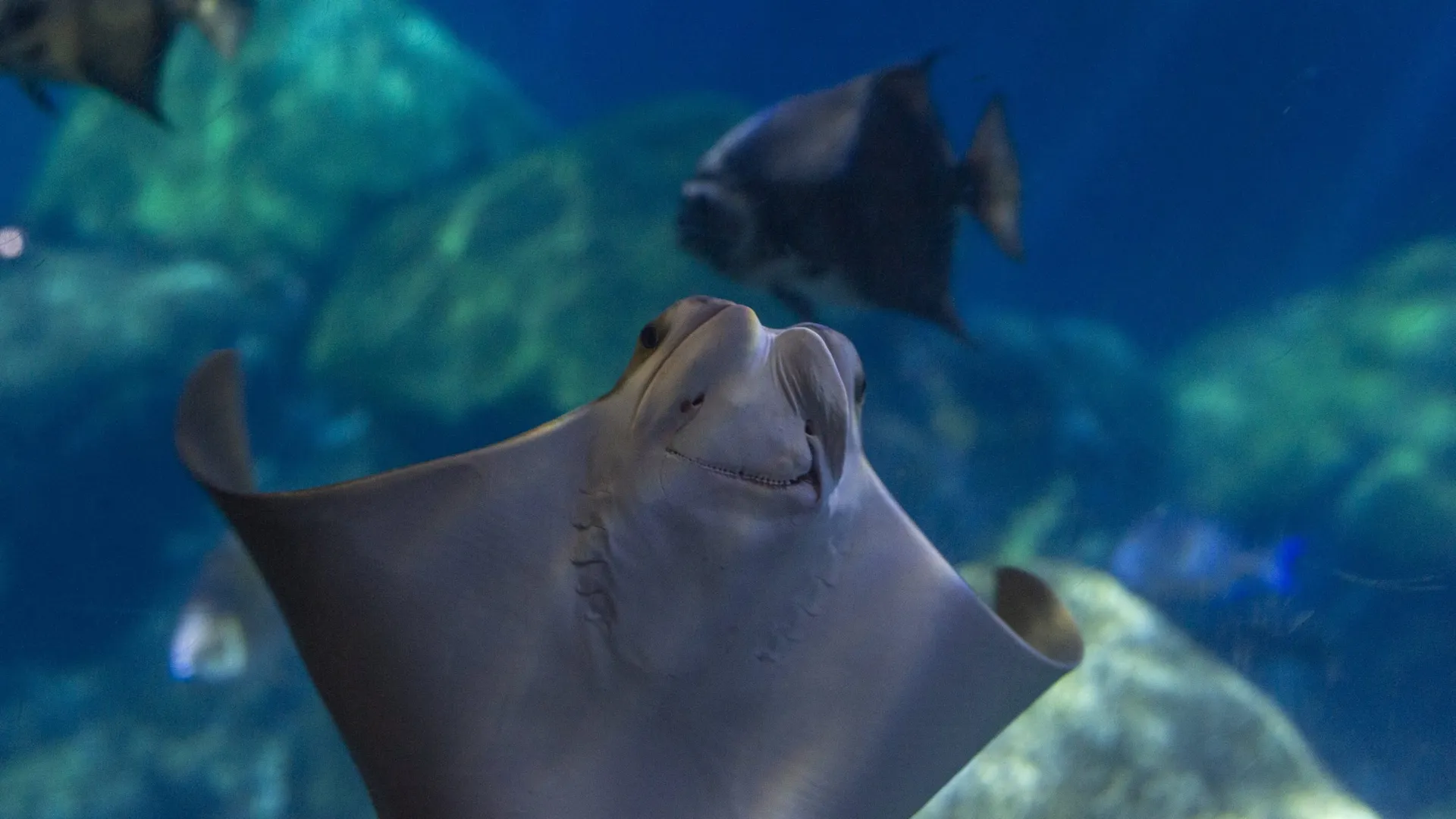 Three times a week, an aquarist or volunteer lies prone on a cardboard pad above the 615,000-gallon Secret Reef exhibit to hand feed the habitat’s many Southern Stingrays and Cownose Rays. These peckish elasmobranchs rocket up the side of the exhibit wall and out of the water to grab tasty morsels of diced seafood, which makes for a decidedly wet and wild mealtime!