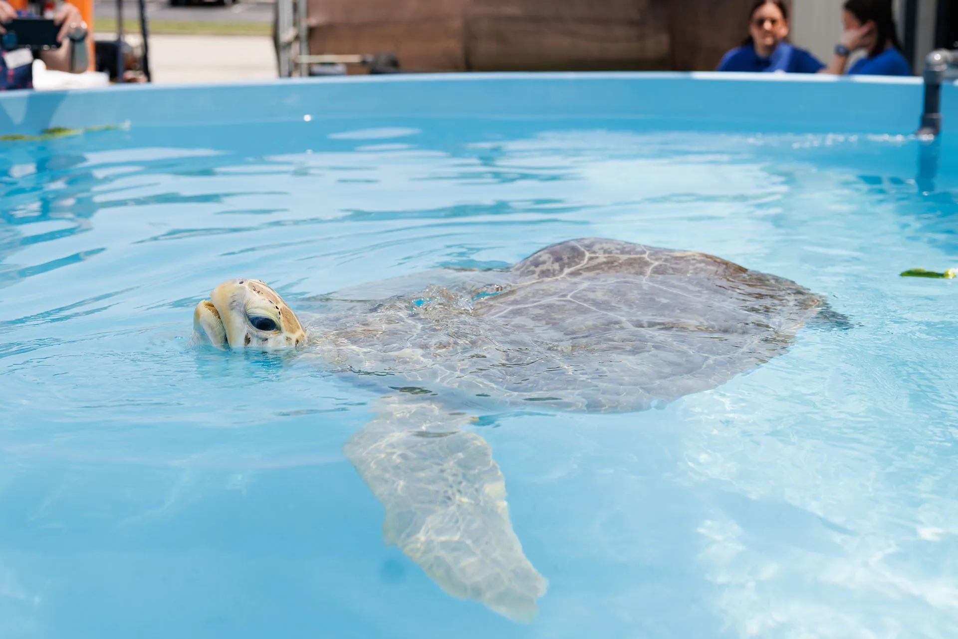 Reaching this point in Oscar’s lengthy story was no easy feat. After his rescue, he was taken to Florida’s Marine Science Center, where caregivers worked tirelessly to address the significant injuries caused by his boat strike. His rear flippers were mangled, his shell was deeply gouged by the propeller and the repairs to address the damage left him with a pocket of air inside his shell. This surplus of air resulted in positive buoyancy syndrome, also known as “bubble butt syndrome,” which causes the rear end of Oscar’s shell to rise above his head, making it difficult to swim or dive.
